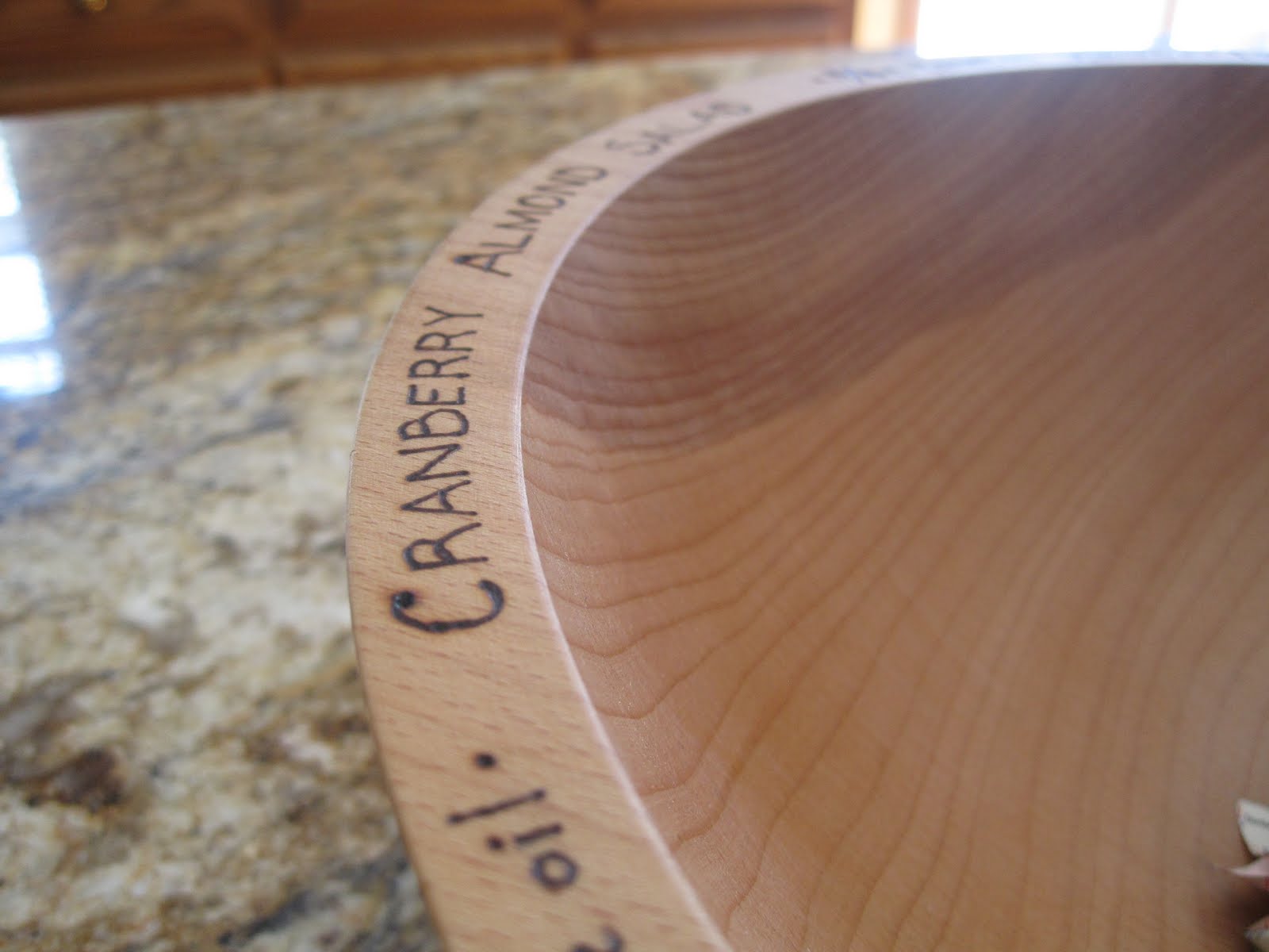 I ended up finding the bowl at Crate & Barrel and found a salad & dressing recipe that would fit. I bought a wood burner and used the pointed tip to produce clear lettering and practiced on a scrap piece of wood before beginning on the bowl. Overall, it was a fairly easy craft and I think it's lovely.